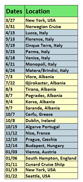 It's January 2026 and we just arrived home (see the map below). 2025 was the beginning of our Epic Retirement Journey. After reading other BLOGs and watching other VLOGs to learn how, we successfully traveled to and through Europe for 10 consecutive months. The chart on the right shows our 2025 Adventure pathway into and out of the united Schengen Zone. The Schengen Zones are colored in blue while non-Schengen zones are colored yellow.