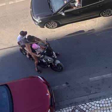 Automobile drivers: All kinds of people are seen driving past our balcony. Some with dogs, some with children. We shake our heads most when we see an infant being held in the front seat by an adult or a toddler standing on the passenger floorboards looking out the front windshield. Seatbelts are a suggestion here.