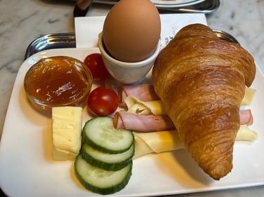 A typical European breakfast: Croissant, Austrian butter, apricot jam, cucumbers, tomatoes, soft boiled egg, ham, and cheese.
