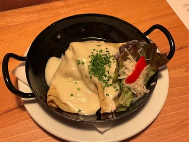 Ungarische Fleisch Palatschinke: An Austrian pancake filled with sweet or savory ingredients. This one is filled with minced meat and topped with cheese.