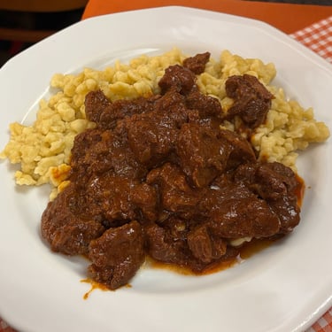 We made sure to purchase some Hungarian paprika for use at home. This recipe from Authentic Austrian Beef Goulash felt the most authentic and best color match to the goulash we enjoyed most. The first night we ate it with mashed potatoes. The leftovers were eaten with pappardelle pasta. We decided that German spätzle would be the best accompaniment for the goulash. Not to be rushed, this wonderful stew needs about 3-4 hours of cooking time to really develop the color and flavor profile. But WOW it’s worth every minute!