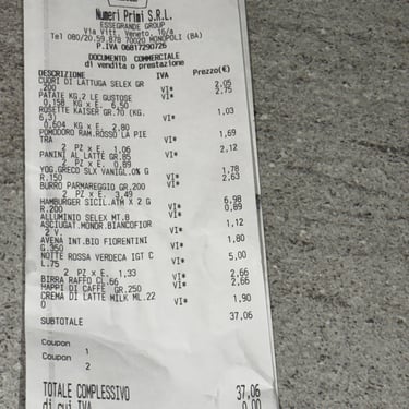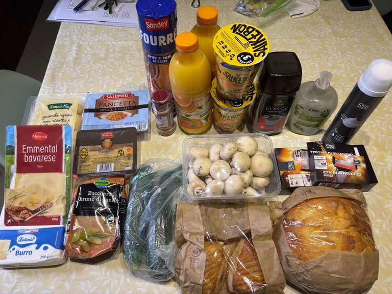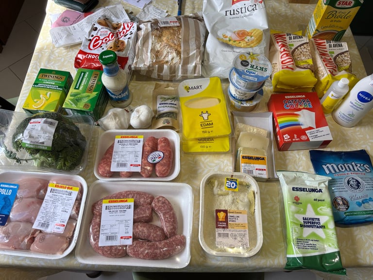 Pictured below in white you will see a common grocery purchase with prices for Parma, Italy.