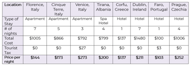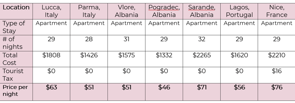 To help you consider if Europe is affordable for you, here is a comparison of the different accommodations in which we chose to live. Except for Saranda, all our apartments had 1 bedroom and one bathroom. Saranda had two of each and was chosen specifically for location by the beach. You can see photos of these accommodations on our travel pages for each destination.
