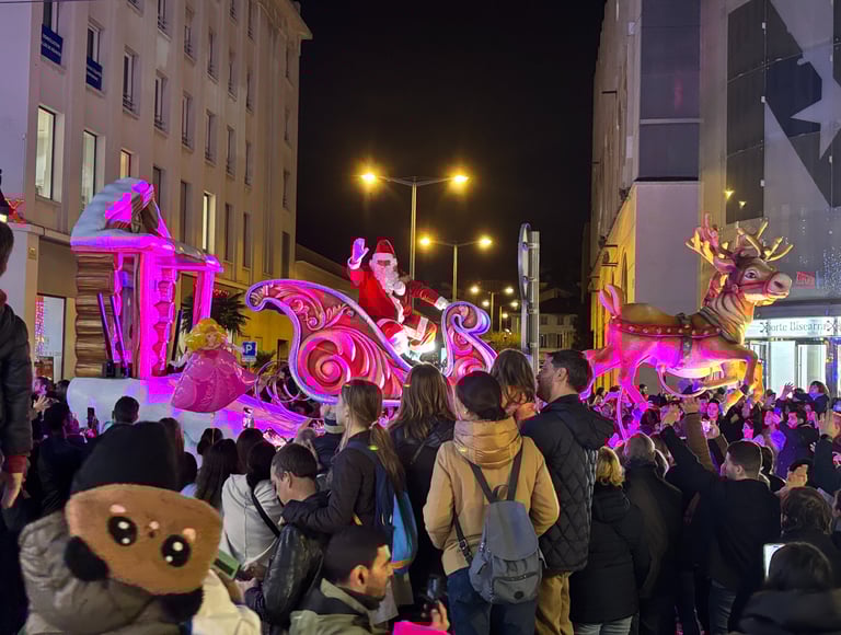 Santa Clause is Coming to Town and floating above the people in the streets as the parade slips through the longest street in Nice, France. He waves to everyone as he passes and stirs up happiness and hope in adults while escalating excitement amongst the children. The joy of the season just geared up a notch.