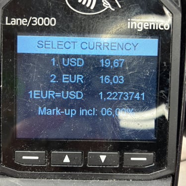 After you tap your card or phone, you will be prompted to pay in your HOME currency or in the LOCAL currency. With this photo example, we were prompted to choose our payment in USD or in Euro. If we chose USD, the store would complete the international conversion and charge us a fee on top of it. The total conversion would be €1,2273741 even though the internation rate for banks that day was €1,1671. Instead, we chose to pay in Euro which then forces the store and the credit card to use the international rate of the day.