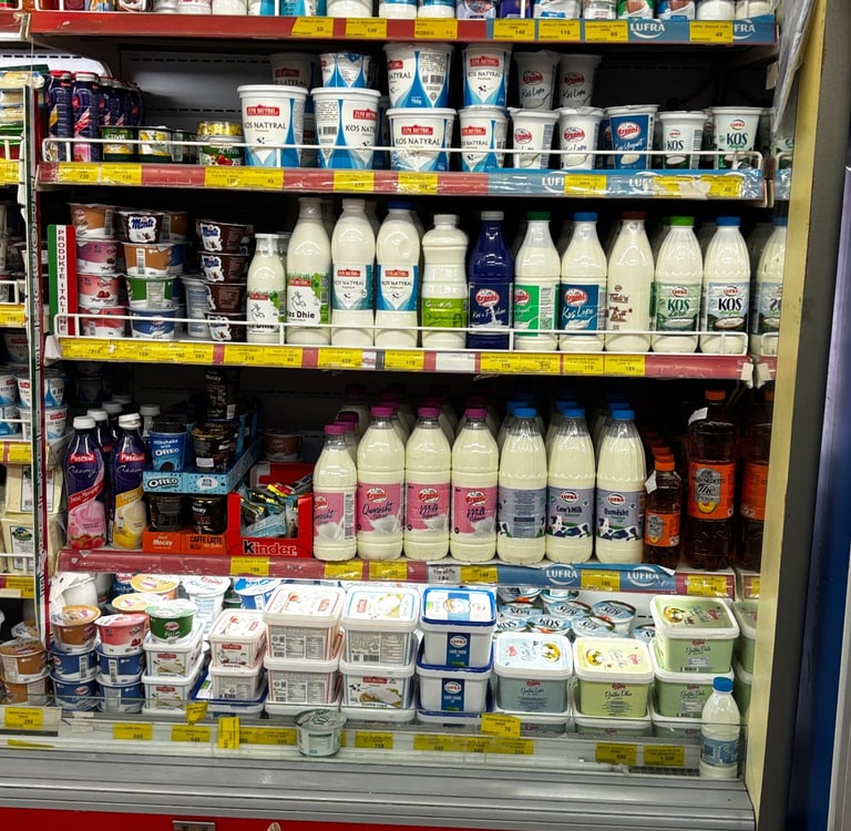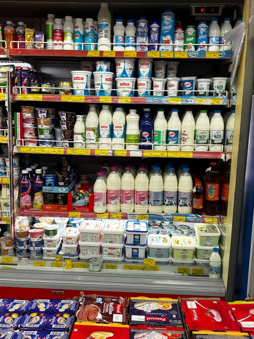 Cow's milk, in the cold case, right? No! These are the Albanian yogurt drinks.