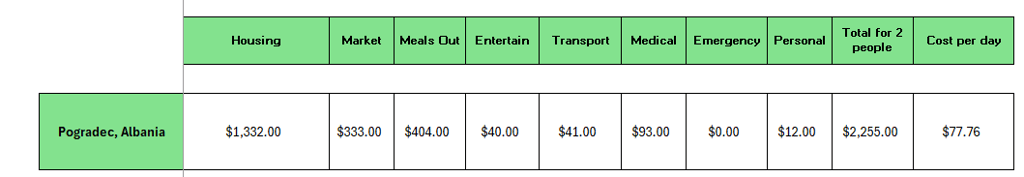 Analyzed Costs: How much did we spend? We had the stomach bug which floating about town during this location, which kept some of our costs lower, but Pogradec was, by far, the cheapest location for us despite that hiccup. In the medical category, we purchased some hydration powder and Greg got three months of prescription medications.