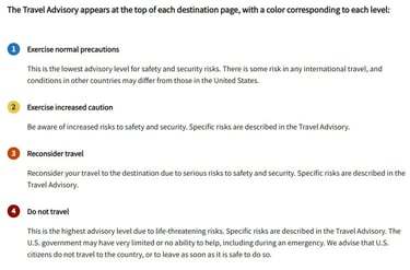 What risk level does the state department assign this destination in their international travel advisory map (Level 1, 2, 3, or 4) and which risk indicators were noted?