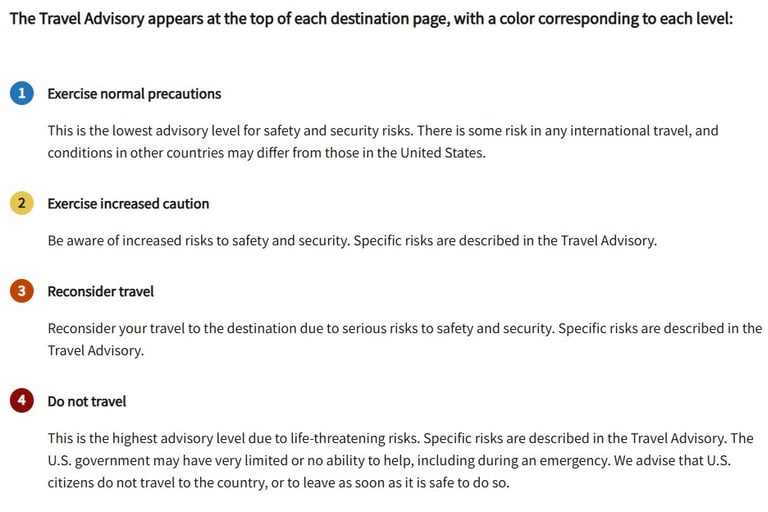 No one wants to get into all this research just for a vacation. But, what’s the alternative? Stay home? It's important to know what is happening in the potential vacation destination. Is everything dandy? Are there some protests? Is it more serious? Countries that have level 1-2 risk factors by the state department are great choices for a destination. Countries with level 3-4 risk factors are ok for travel if you choose to accept the risk. In our research we found some insurance companies do not cover high risk situations or know situations. For example, the 2026 war in the middle east is a "known" situation and some insurance websites are identifying that on their landing page with details that coverage is not available in that region.