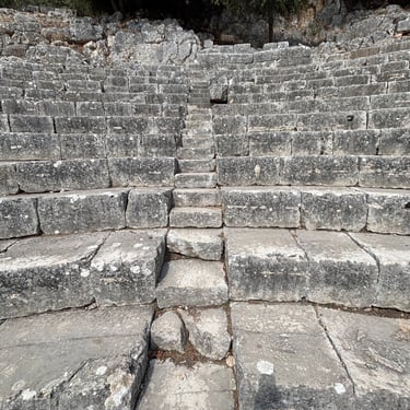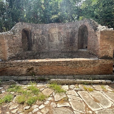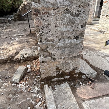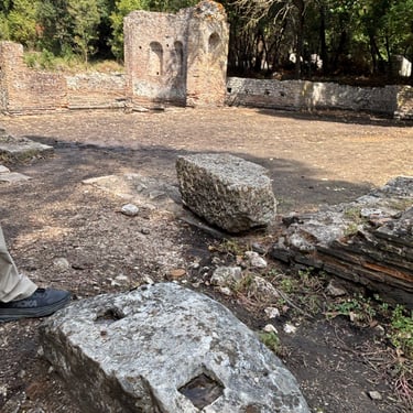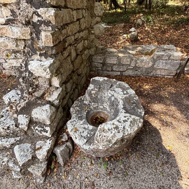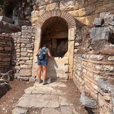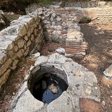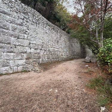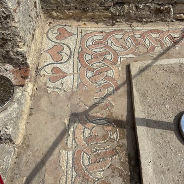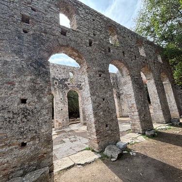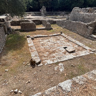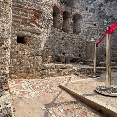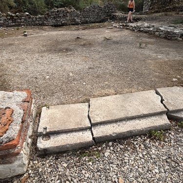 Archeologists have, so far, identified eight churches in Butrint. The Butrint Baptistry rivals some of the early Byzantine monuments found in Italy. Visitors can see the outline here, but the beautiful mosaic floors are currently covered for protection against the elements. The seasonal rise and fall of the lagoon water levels have prevented full restoration at this time. The Great Baptistry was built near the same time as the Butrint Baptistry. When you finish looking at the gigantic walls in wonder, you can see a tiny bit of the mosaic floors.