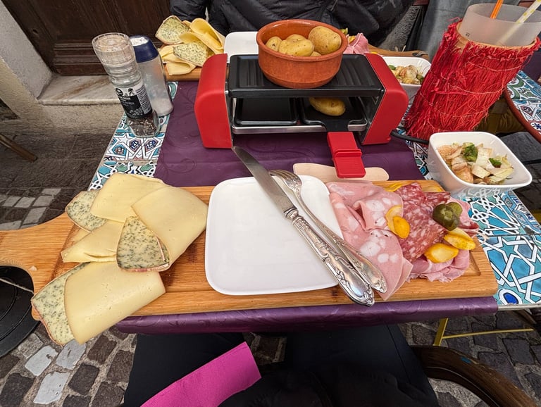 Raclette cheese and melting grill: This NEW way of enjoying charcuterie made for a delightful afternoon at a sidewalk cafe.