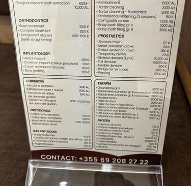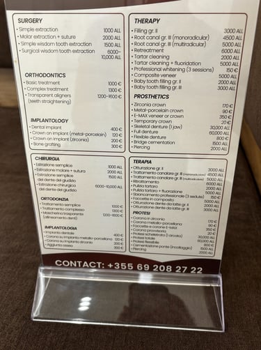 Toddling back at the required time, we were greeted warmly by a receptionist in scrubs and a single dentist, Dr. Maksuti. Taking Greg first into the chair, there was no paperwork, no x-rays, and no history taken. Dr. Maksuti glanced in the mouth and cleaned Greg’s teeth in a matter of about 10 minutes. A night guard was recommended for Greg’s long-standing teeth grinding. With shock at the rapid turn-around, I was called back next. Similarly, my cleaning took about 15 minutes and with an electronic wand, Dr. Maksuti took four pictures inside my mouth. Displayed on the screen in front of me, he pointed to each photo and explained that my receding gums were causing issues by my prior crowns, which is why I was having sensitivity in those areas. After Greg got impressions for his mouth guard, we arranged to return the next day for a consultation on my crowns. He charged us a total of 7,000 Leke ($84.58) or ($42.29) each for the cleaning.